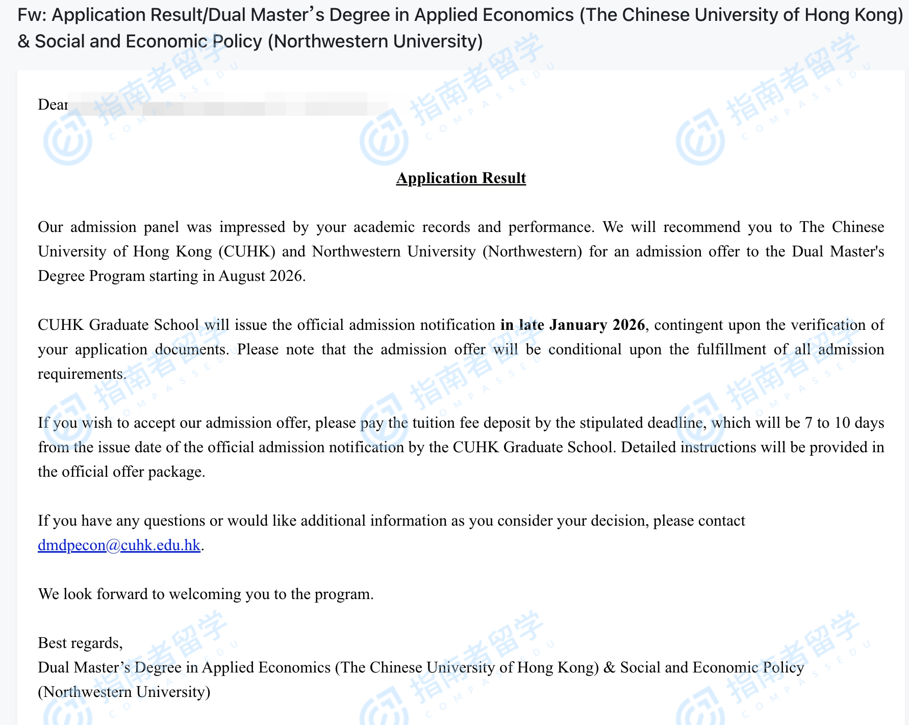 香港中文大學(xué)應(yīng)用經(jīng)濟(jì)學(xué)理學(xué)碩士&社會(huì)與經(jīng)濟(jì)政策理學(xué)碩士雙學(xué)位(香港中文大學(xué)-美國西北大學(xué))研究生offer一枚