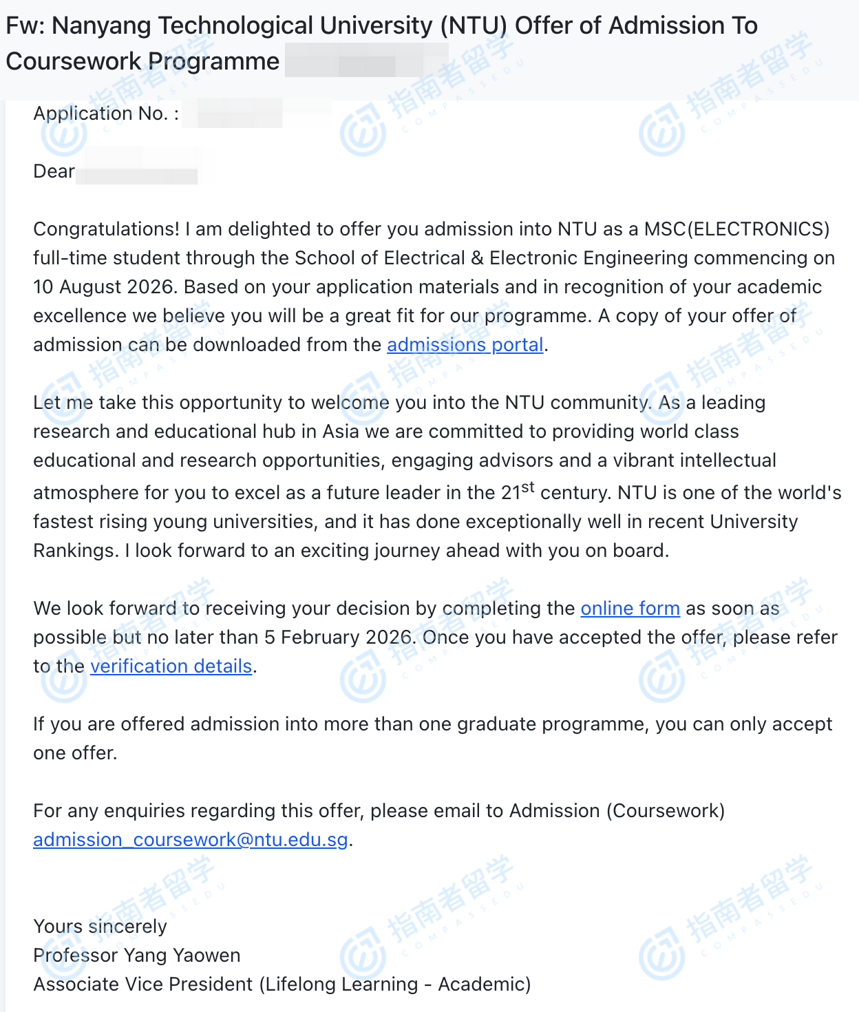 南洋理工大學(xué)電子學(xué)理學(xué)碩士研究生offer一枚