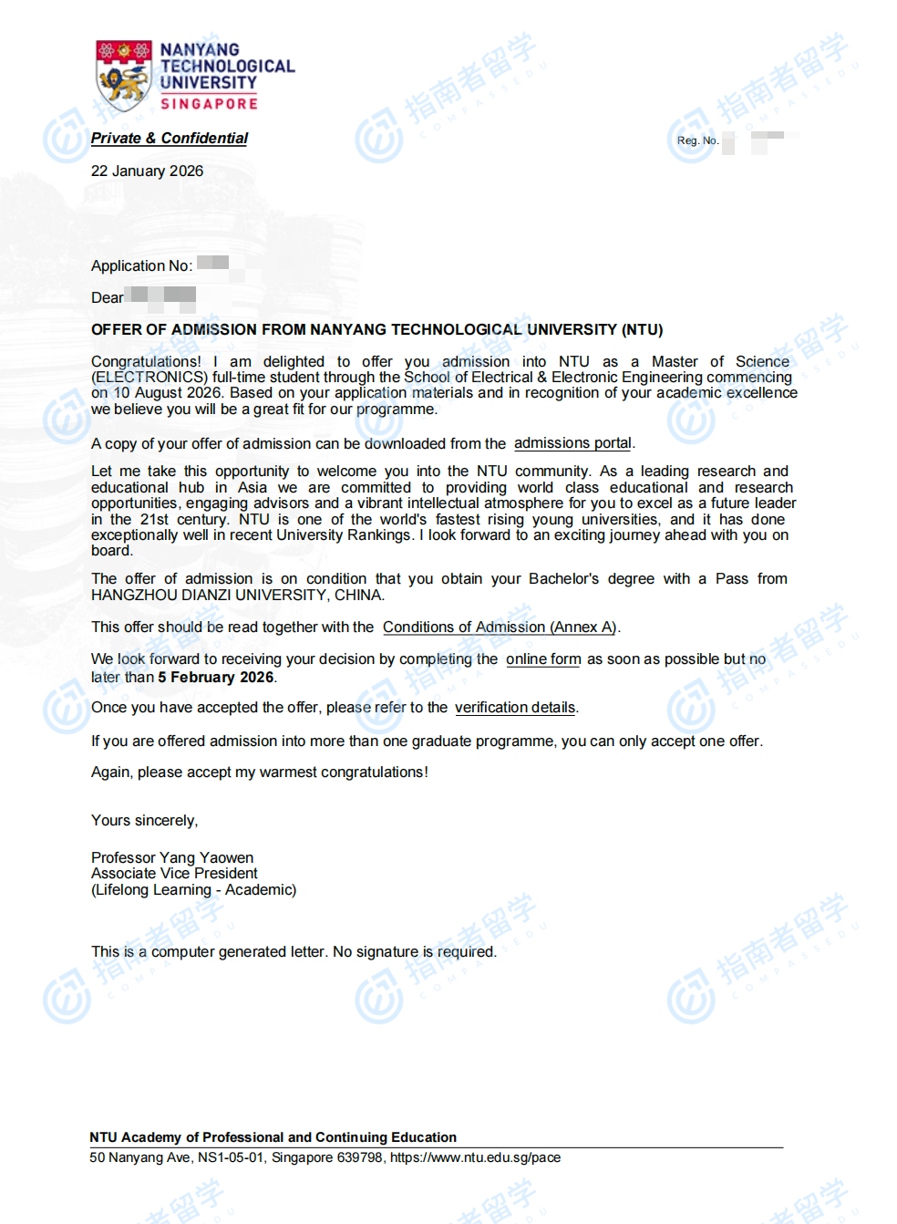 南洋理工大學(xué)電子學(xué)理學(xué)碩士研究生offer一枚