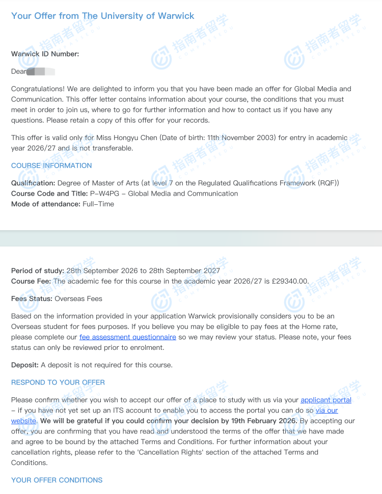 華威大學(xué)全球媒體與傳播文學(xué)碩士研究生offer一枚
