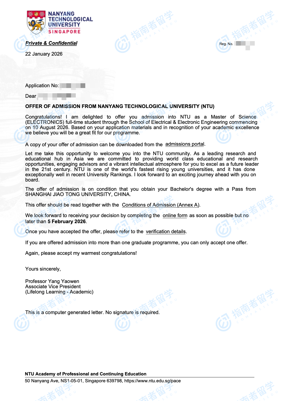 南洋理工大學(xué)電子學(xué)理學(xué)碩士研究生offer一枚