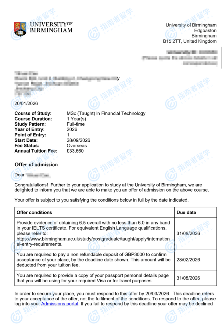 伯明翰大學(xué)金融科技理學(xué)碩士研究生offer一枚