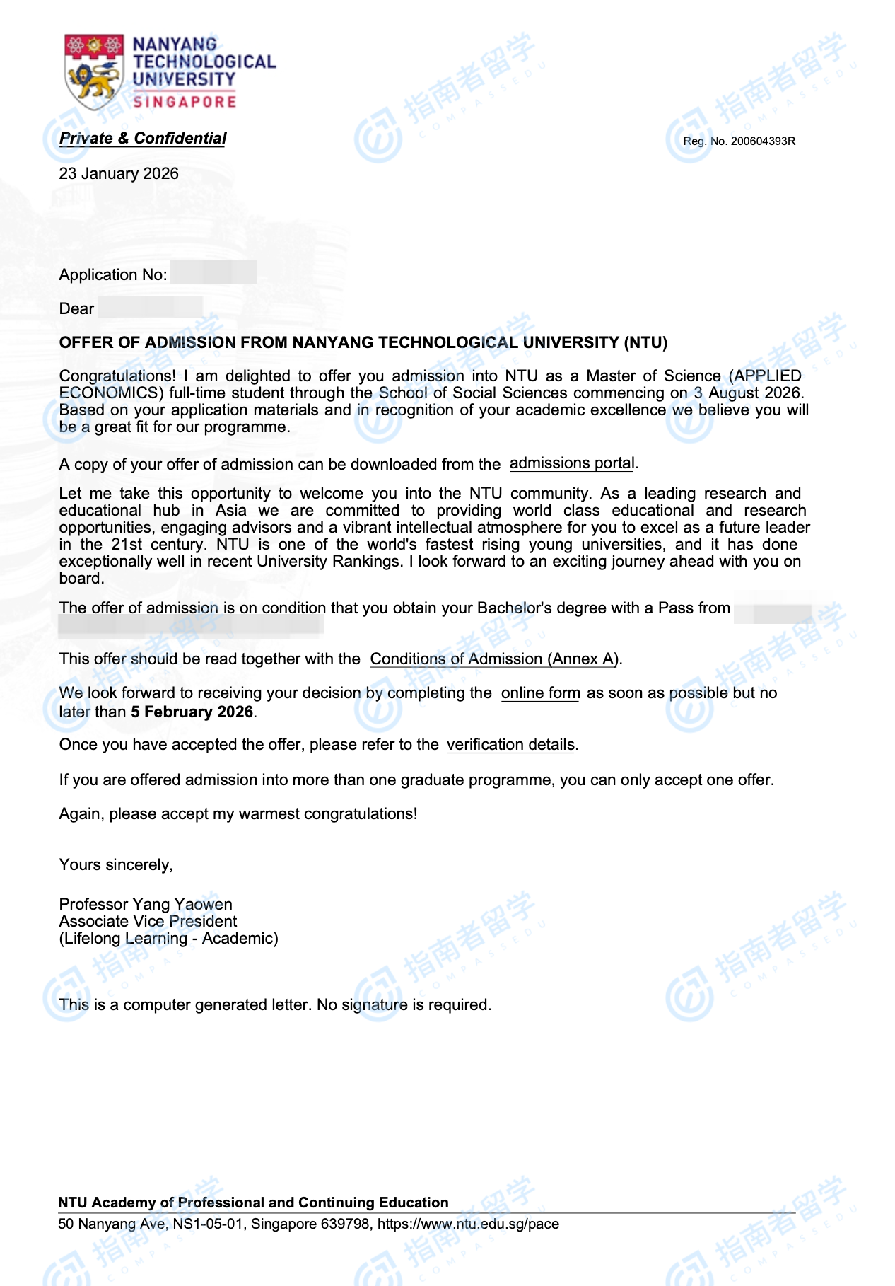 南洋理工大學(xué)應(yīng)用經(jīng)濟(jì)學(xué)理學(xué)碩士研究生offer一枚
