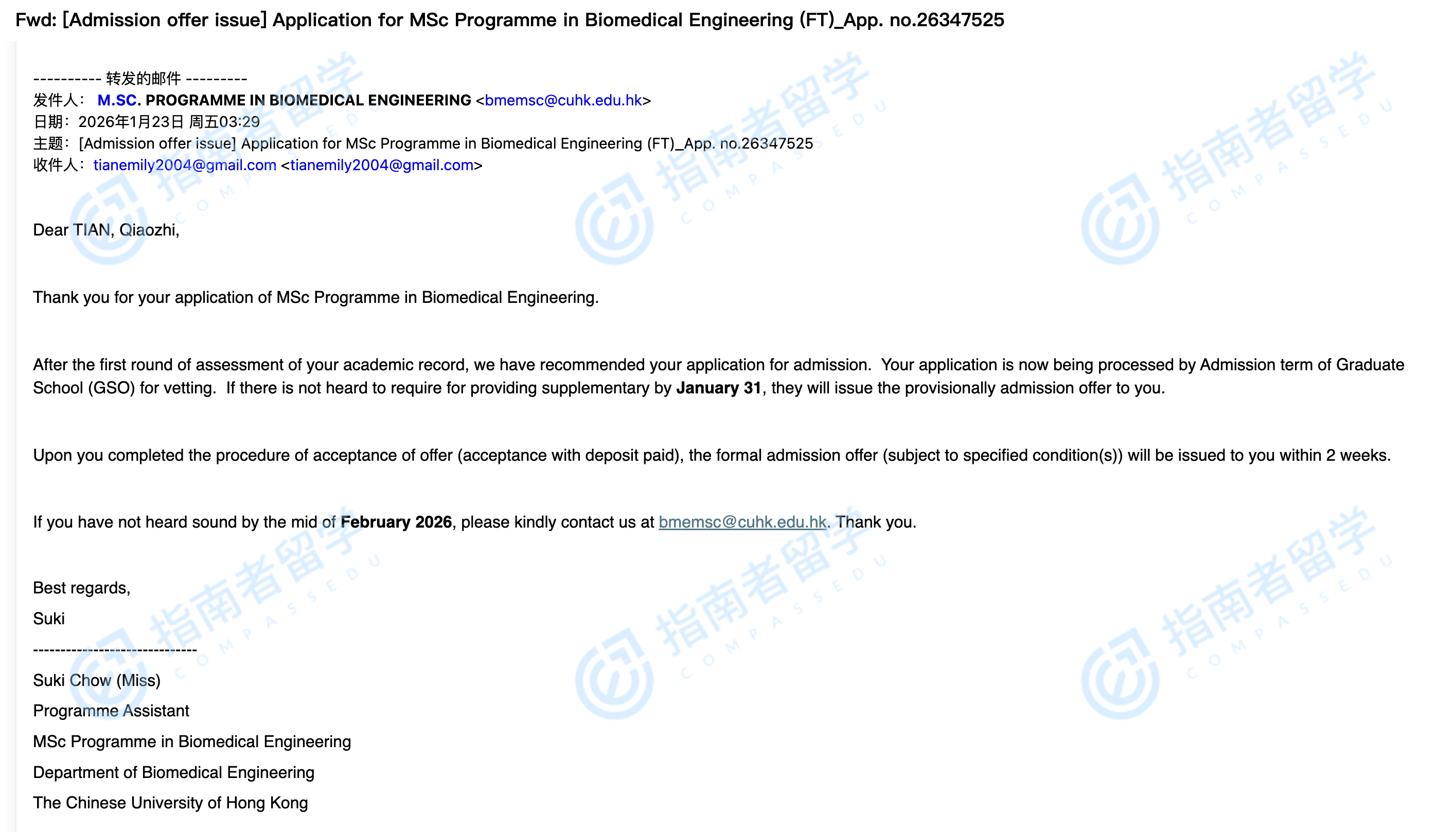 香港中文大學(xué)生物醫(yī)學(xué)工程理學(xué)碩士研究生offer一枚