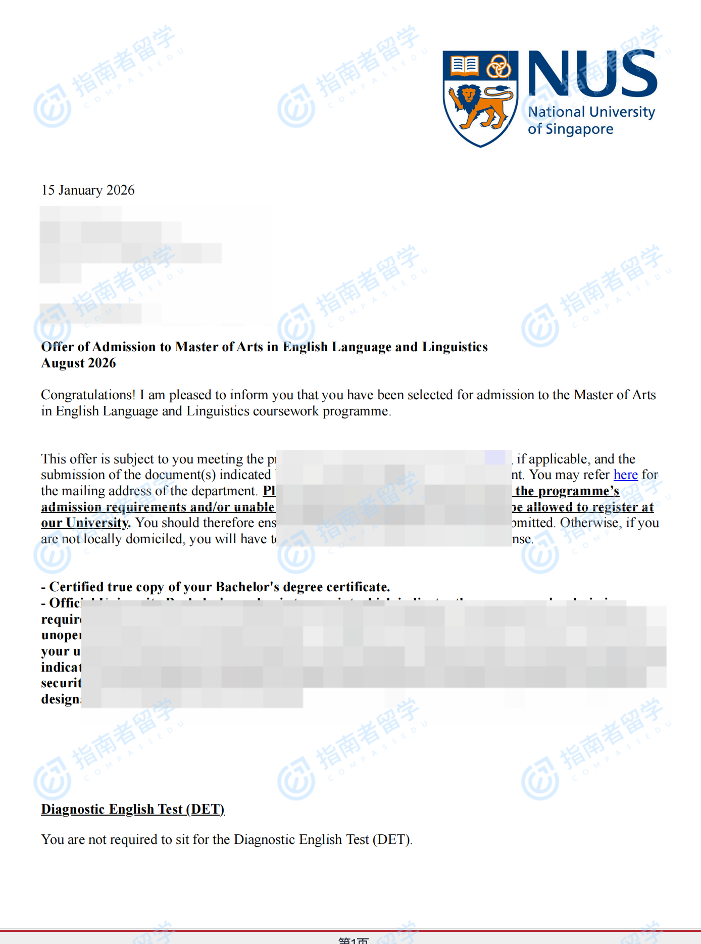 新加坡國(guó)立大學(xué)英語(yǔ)語(yǔ)言與語(yǔ)言學(xué)文學(xué)碩士研究生offer一枚