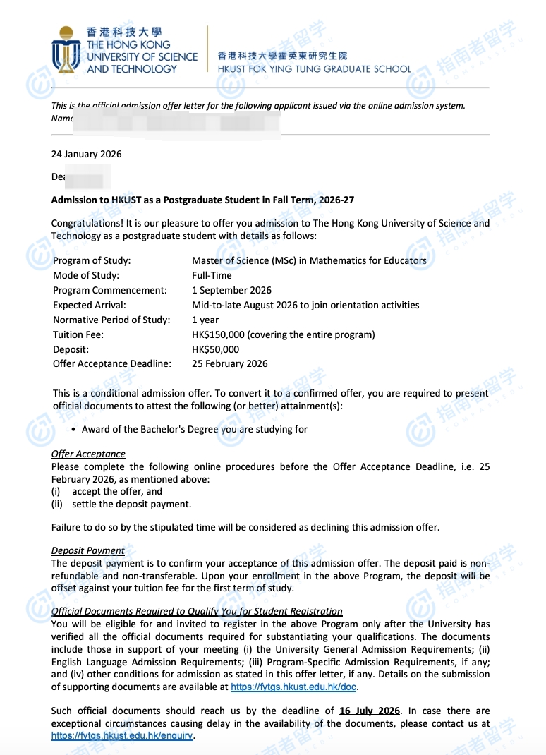 香港科技大學(xué)教育數(shù)學(xué)理學(xué)碩士研究生offer一枚