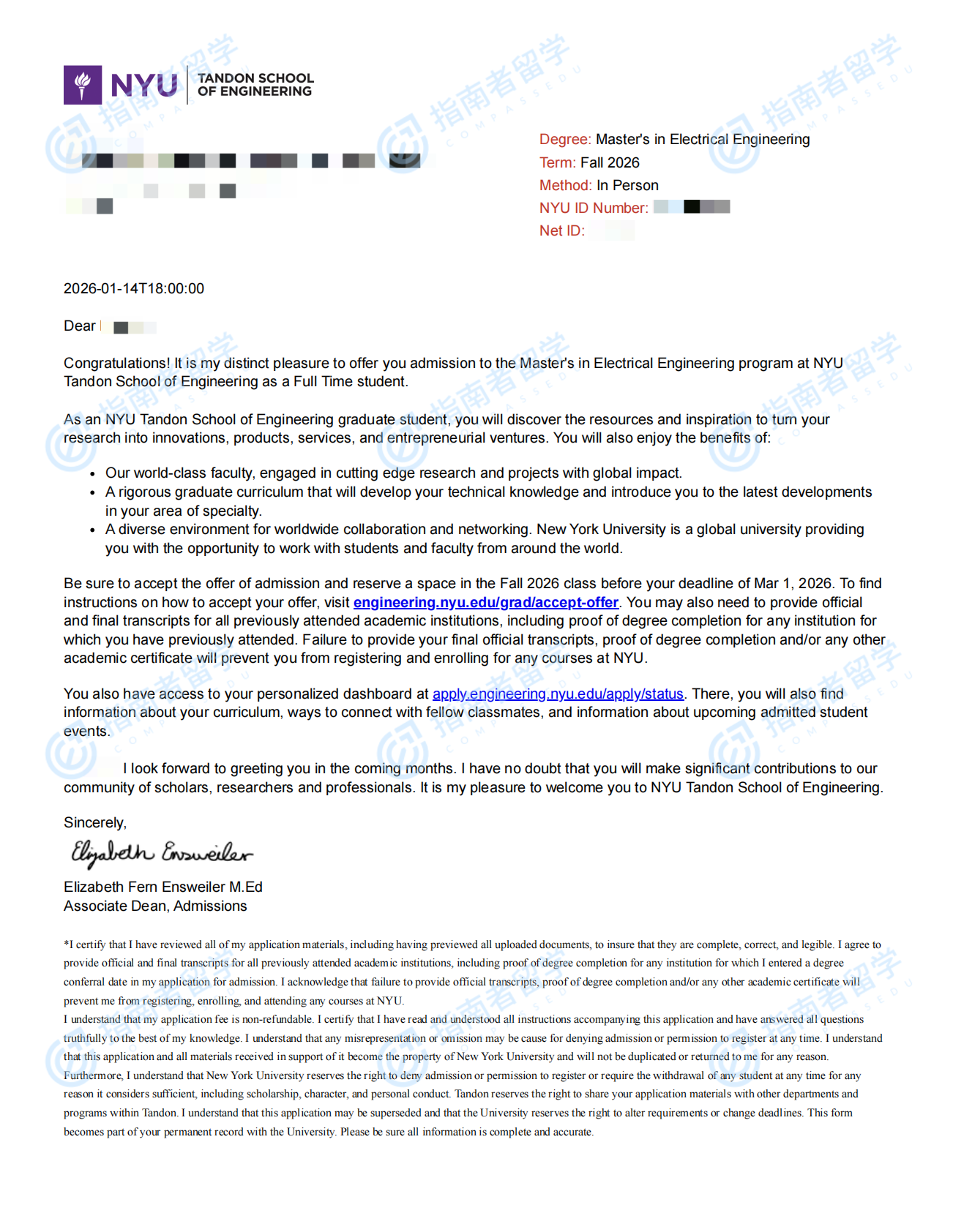 紐約大學(xué)電氣工程碩士研究生offer一枚
