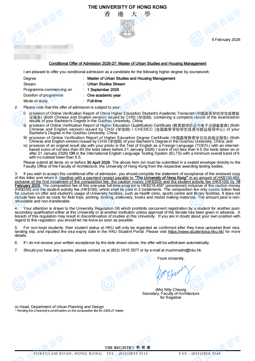 香港大學城市研究與住房管理碩士(專業(yè))研究生offer一枚