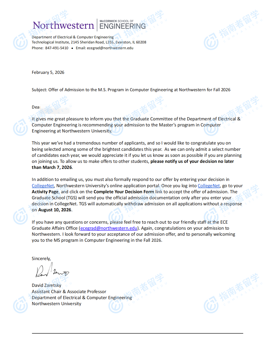 西北大學(xué)(美國(guó))計(jì)算機(jī)工程碩士研究生offer一枚