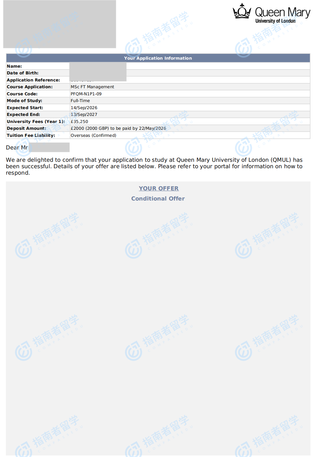 倫敦大學瑪麗皇后學院管理學理學碩士研究生offer一枚