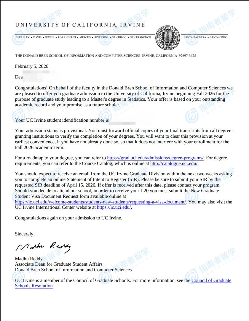 加州大學(xué)歐文分校統(tǒng)計(jì)學(xué)理學(xué)碩士研究生offer一枚