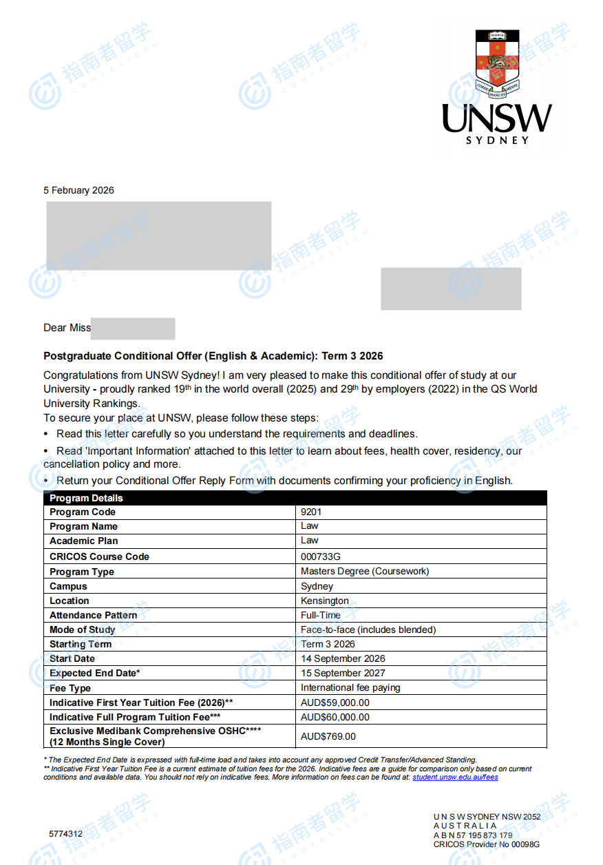 新南威爾士大學法學碩士研究生offer一枚