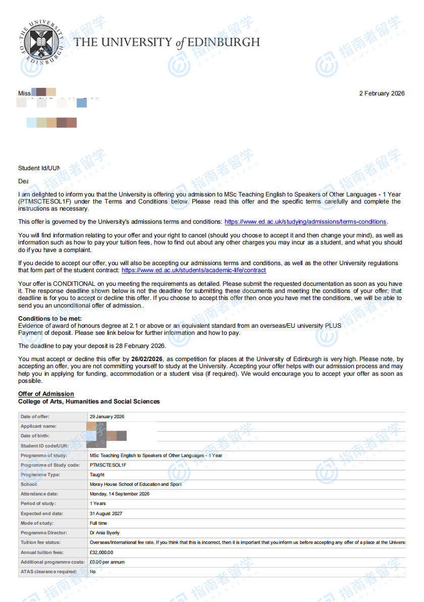 愛(ài)丁堡大學(xué)對(duì)外英語(yǔ)教學(xué)理學(xué)碩士研究生offer一枚