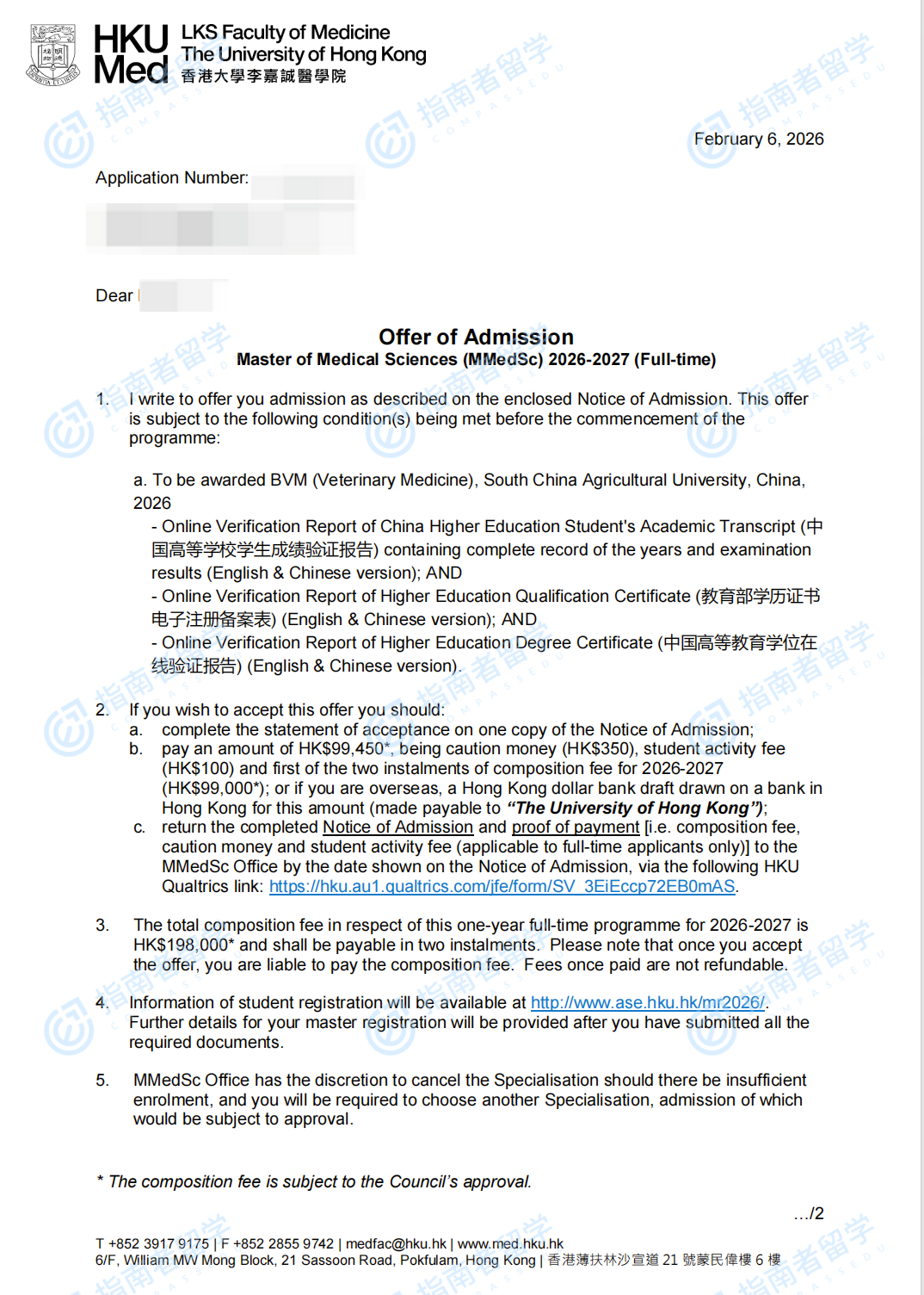 香港大學(xué)醫(yī)學(xué)科學(xué)碩士研究生offer一枚