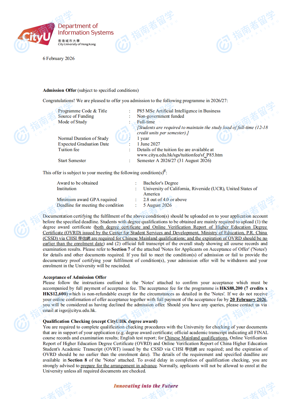 香港城市大學(xué)商業(yè)人工智能理學(xué)碩士研究生offer一枚