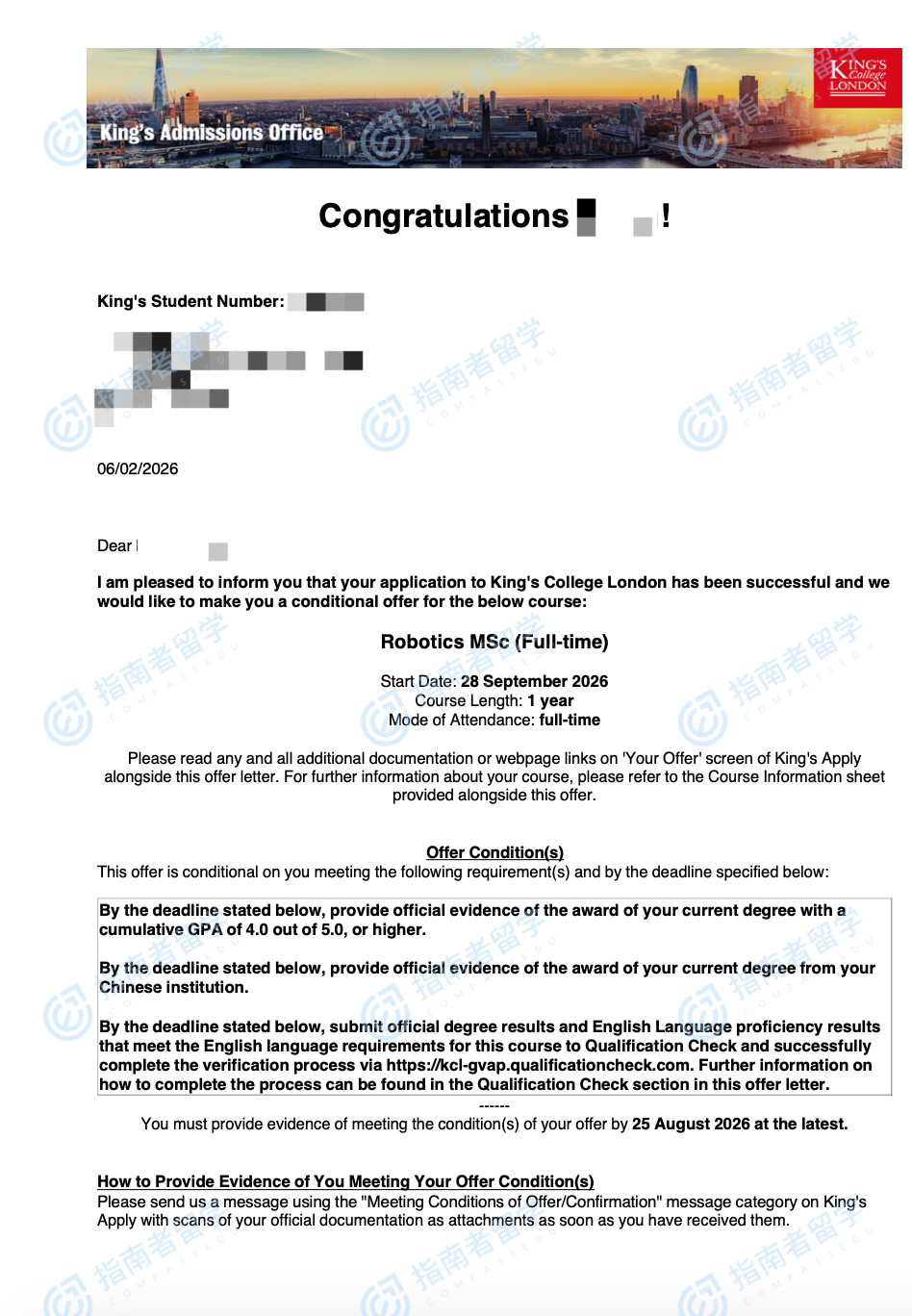 倫敦大學國王學院機器人學理學碩士研究生offer一枚