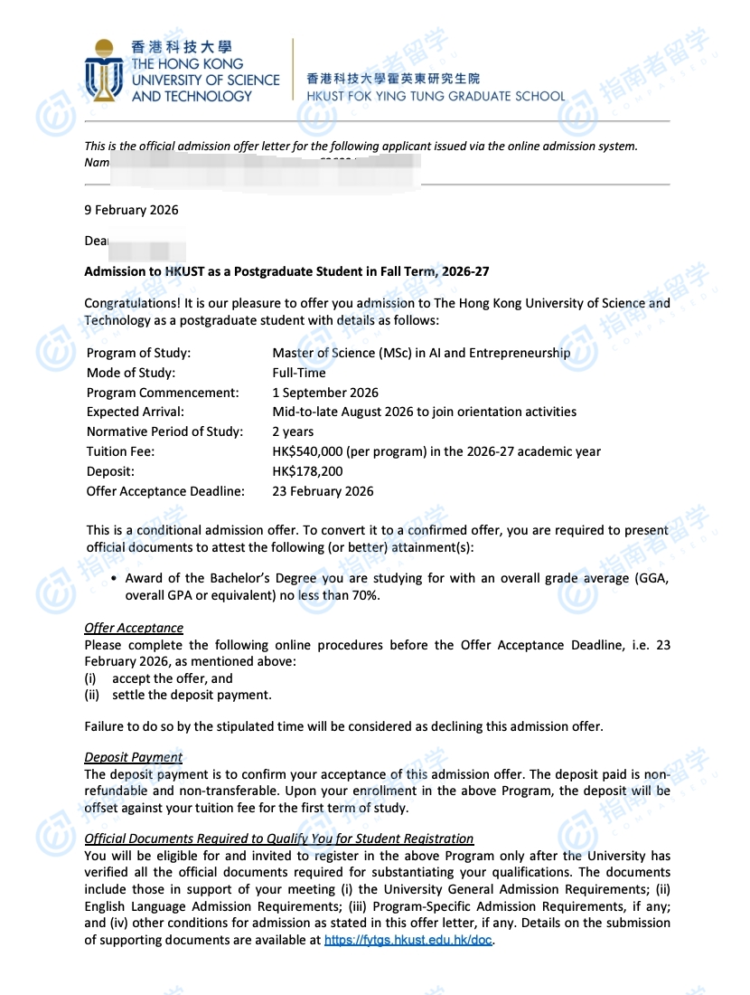 香港科技大學(xué)人工智能與創(chuàng)業(yè)理學(xué)碩士研究生offer一枚
