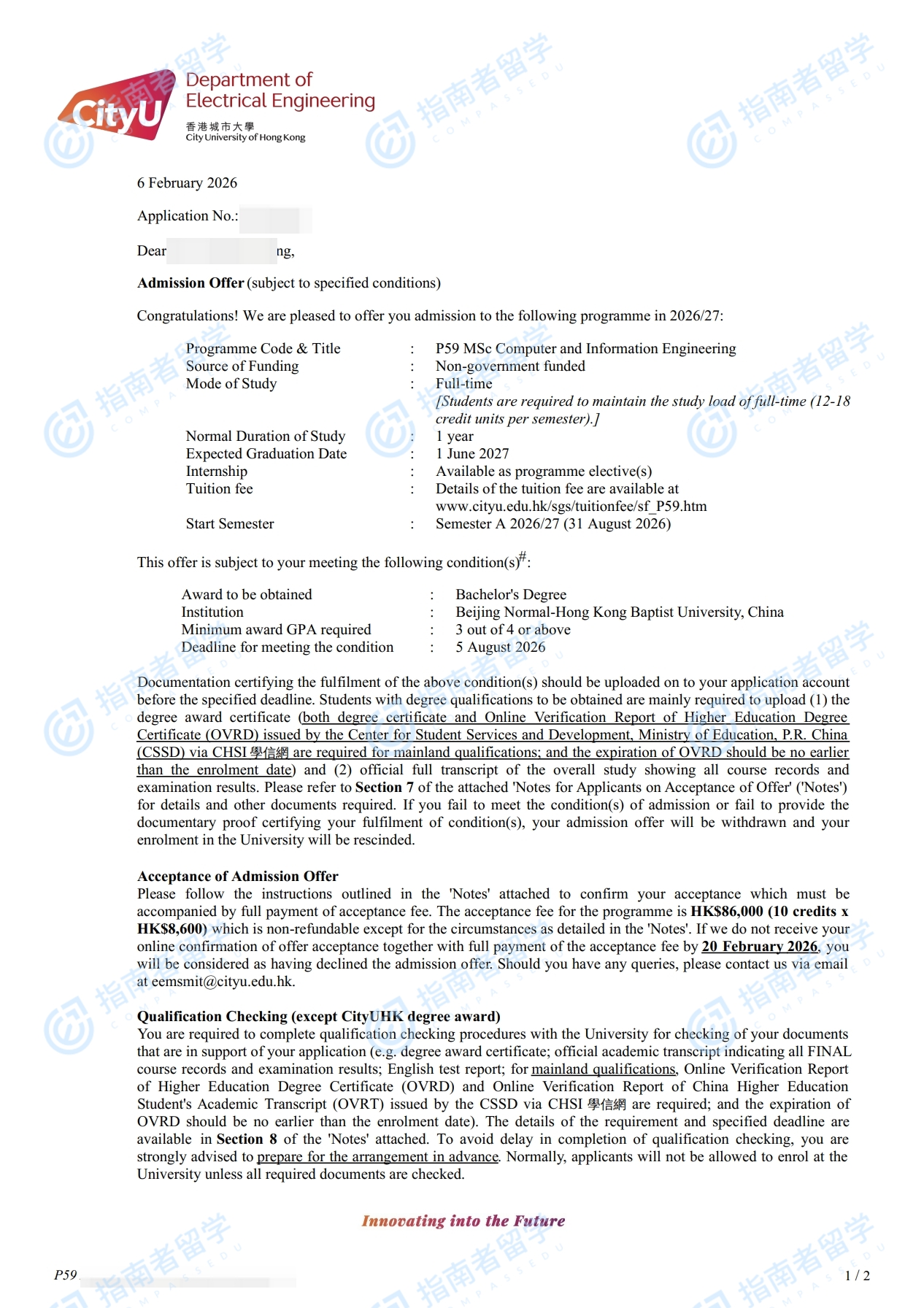 香港城市大學電子計算機與資訊工程理學碩士研究生offer一枚