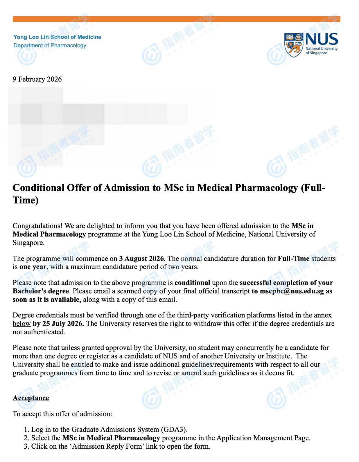 新加坡國立大學(xué)醫(yī)學(xué)藥理學(xué)理學(xué)碩士研究生offer一枚