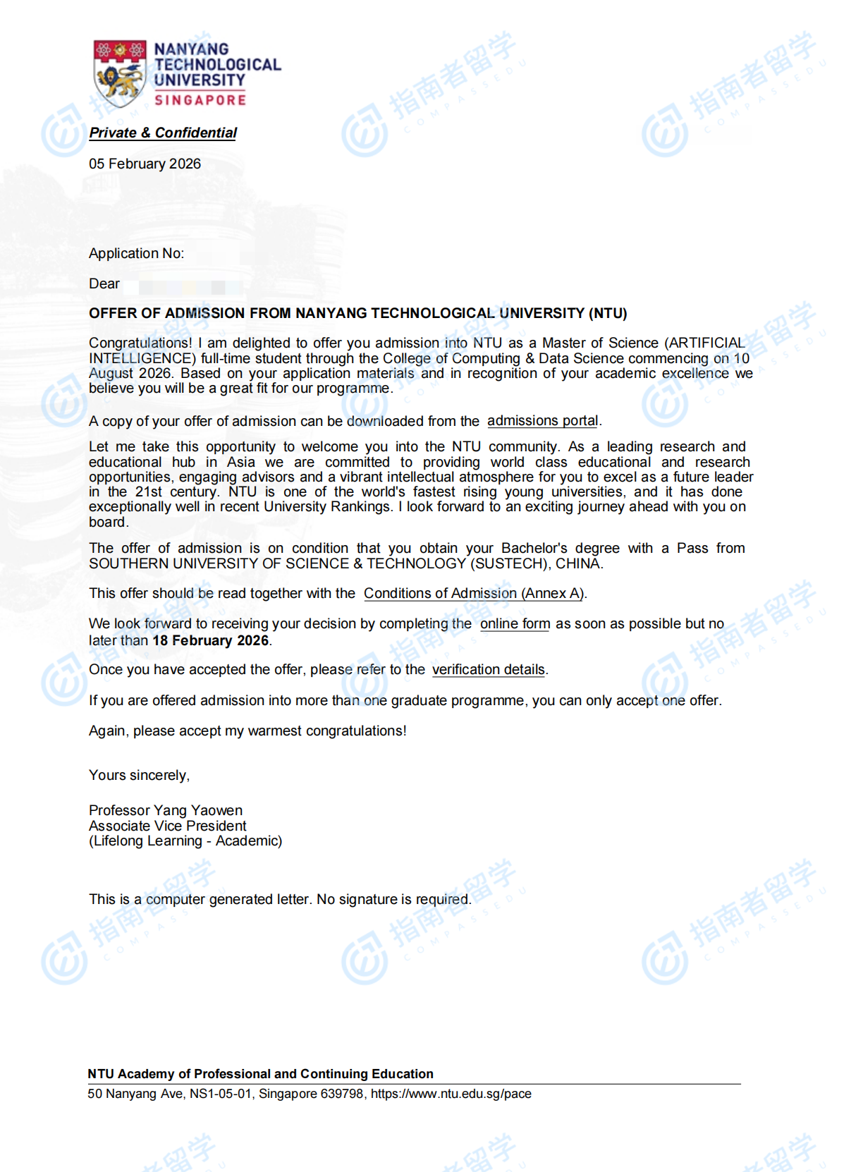 南洋理工大學(xué)人工智能理學(xué)碩士研究生offer一枚