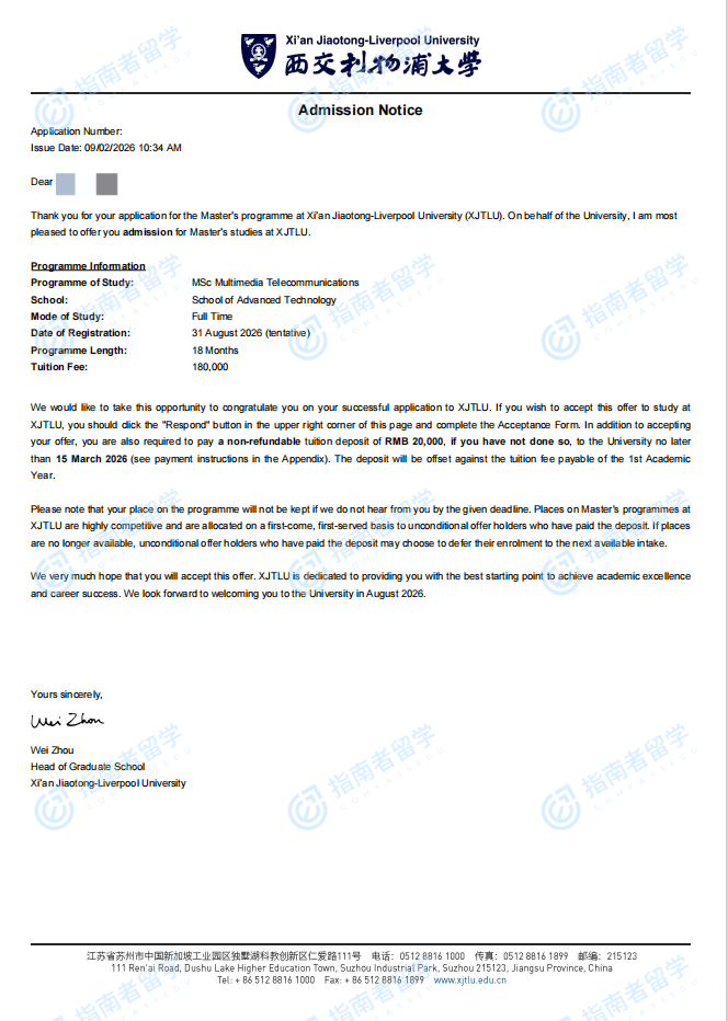 西交利物浦大學多媒體通信理學碩士研究生offer一枚