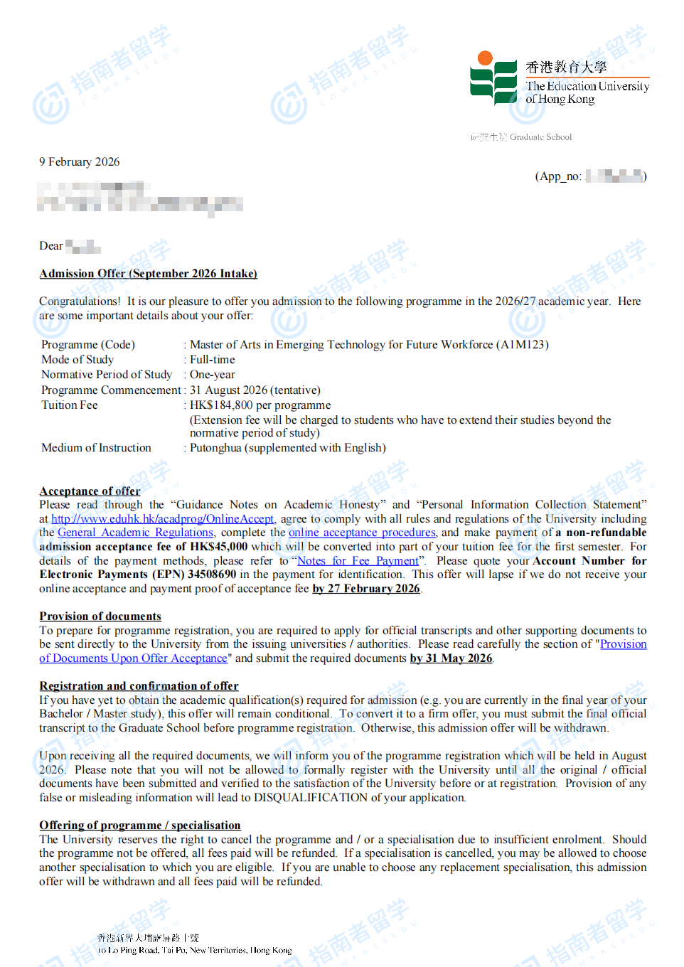 香港教育大學(xué)新興科技賦能的未來人力文學(xué)碩士研究生offer一枚
