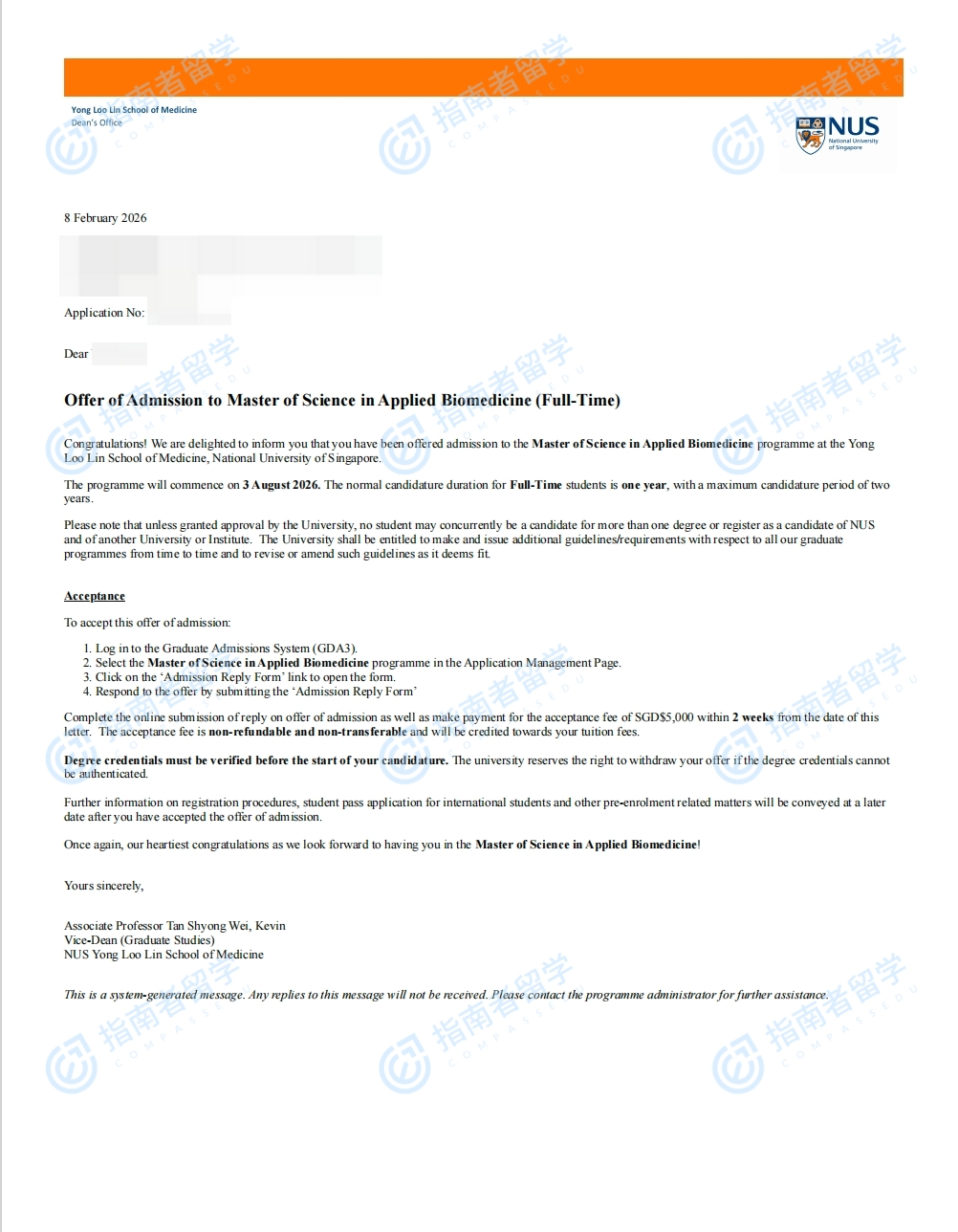 新加坡國(guó)立大學(xué)應(yīng)用生物醫(yī)學(xué)理學(xué)碩士研究生offer一枚