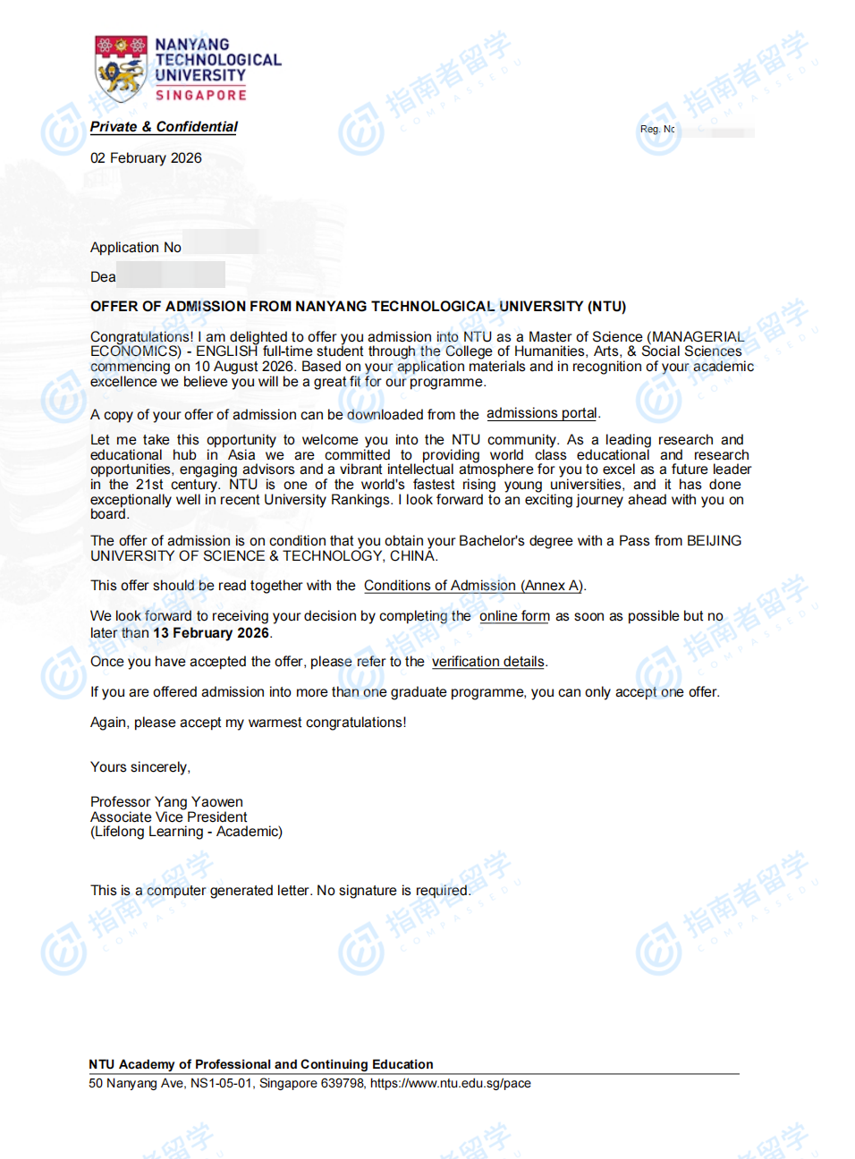 南洋理工大學(xué)管理經(jīng)濟(jì)學(xué)理學(xué)碩士(英文授課)研究生offer一枚