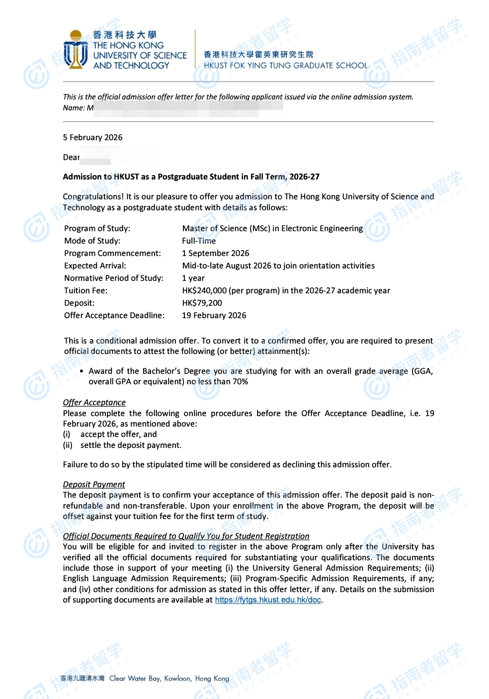 香港科技大學(xué)電子工程理學(xué)碩士研究生offer一枚