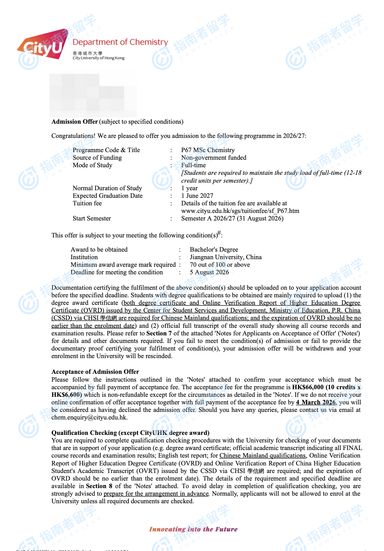 香港城市大學(xué)化學(xué)理學(xué)碩士研究生offer一枚
