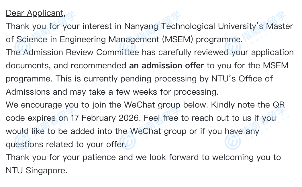 南洋理工大學(xué)工程管理理學(xué)碩士研究生offer一枚