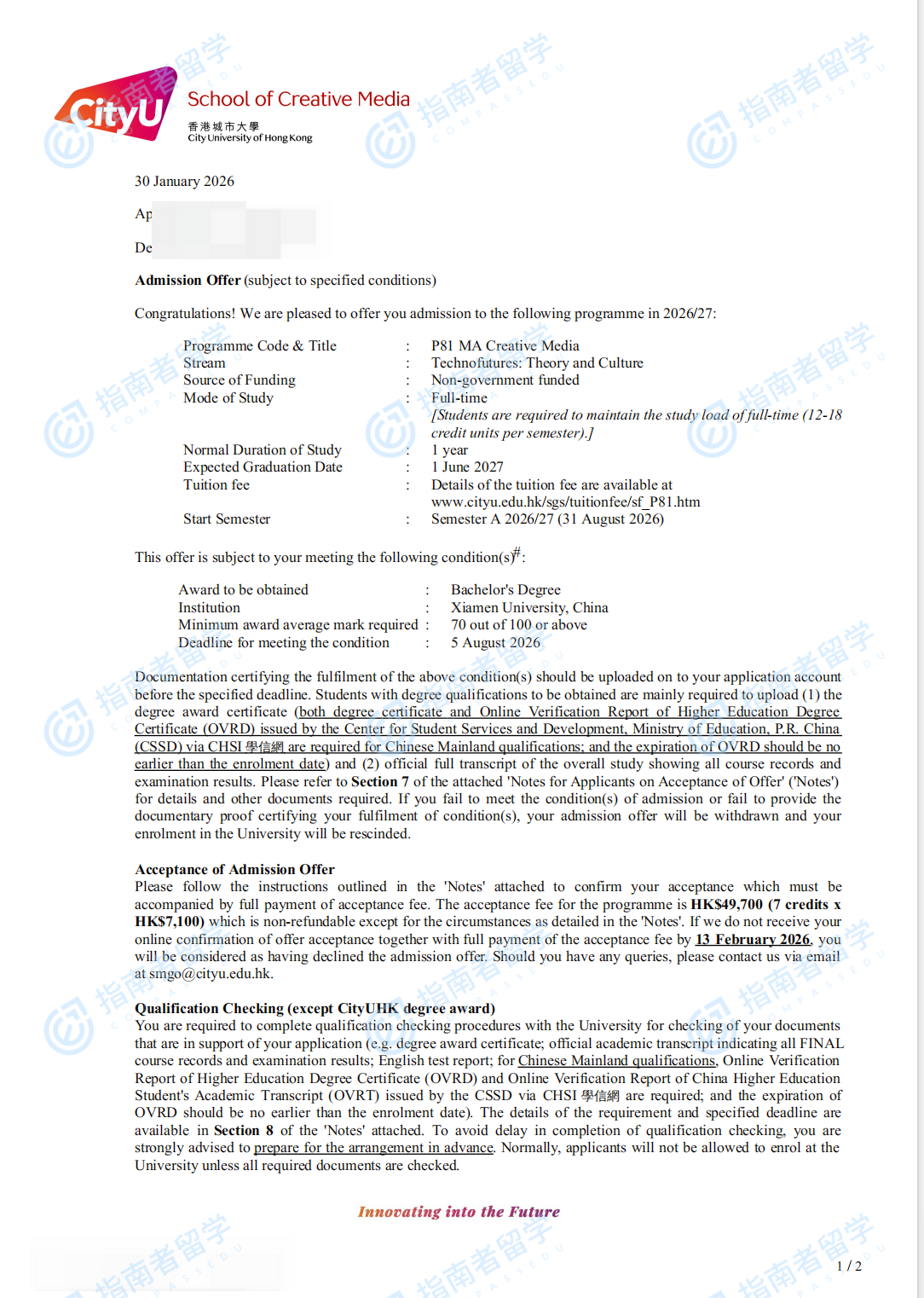 香港城市大學(xué)創(chuàng)意媒體文學(xué)碩士研究生offer一枚