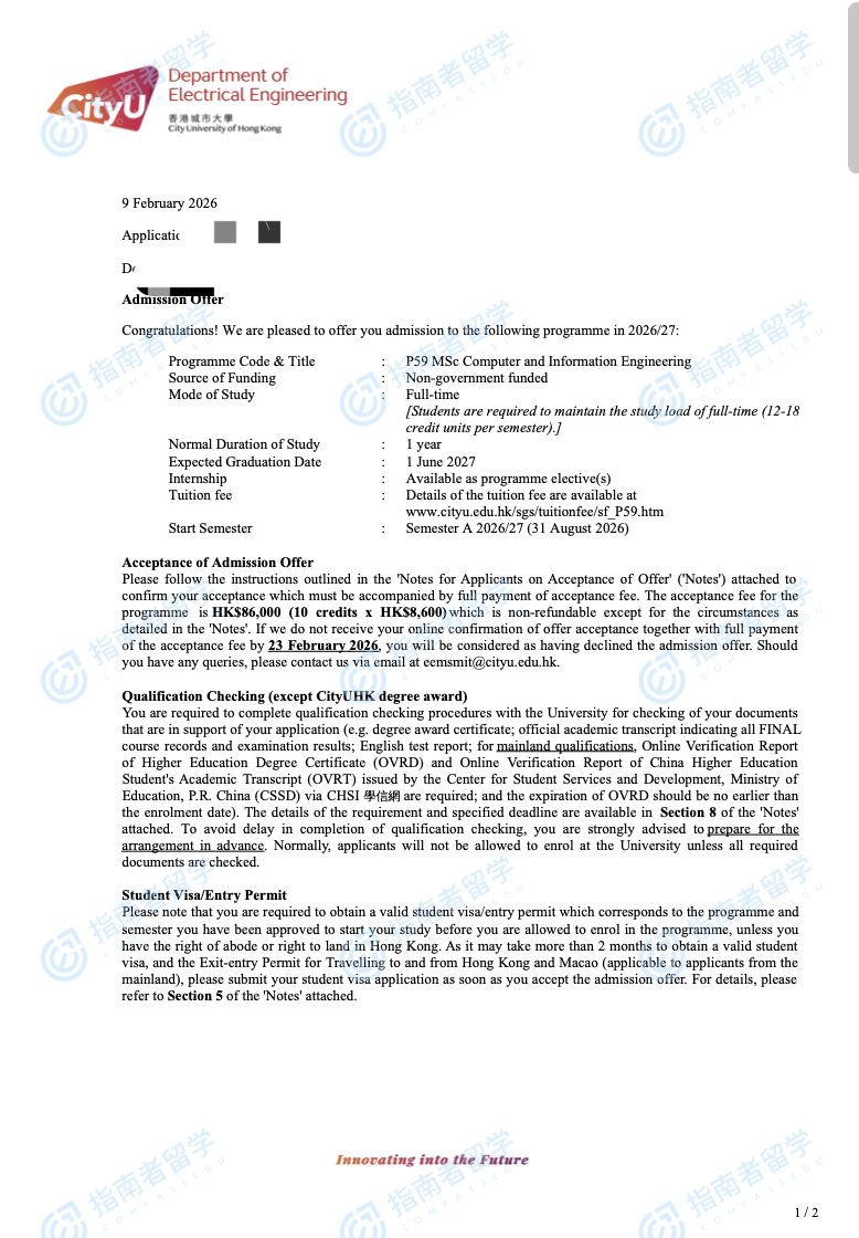 香港城市大學(xué)電子計(jì)算機(jī)與資訊工程理學(xué)碩士研究生offer一枚