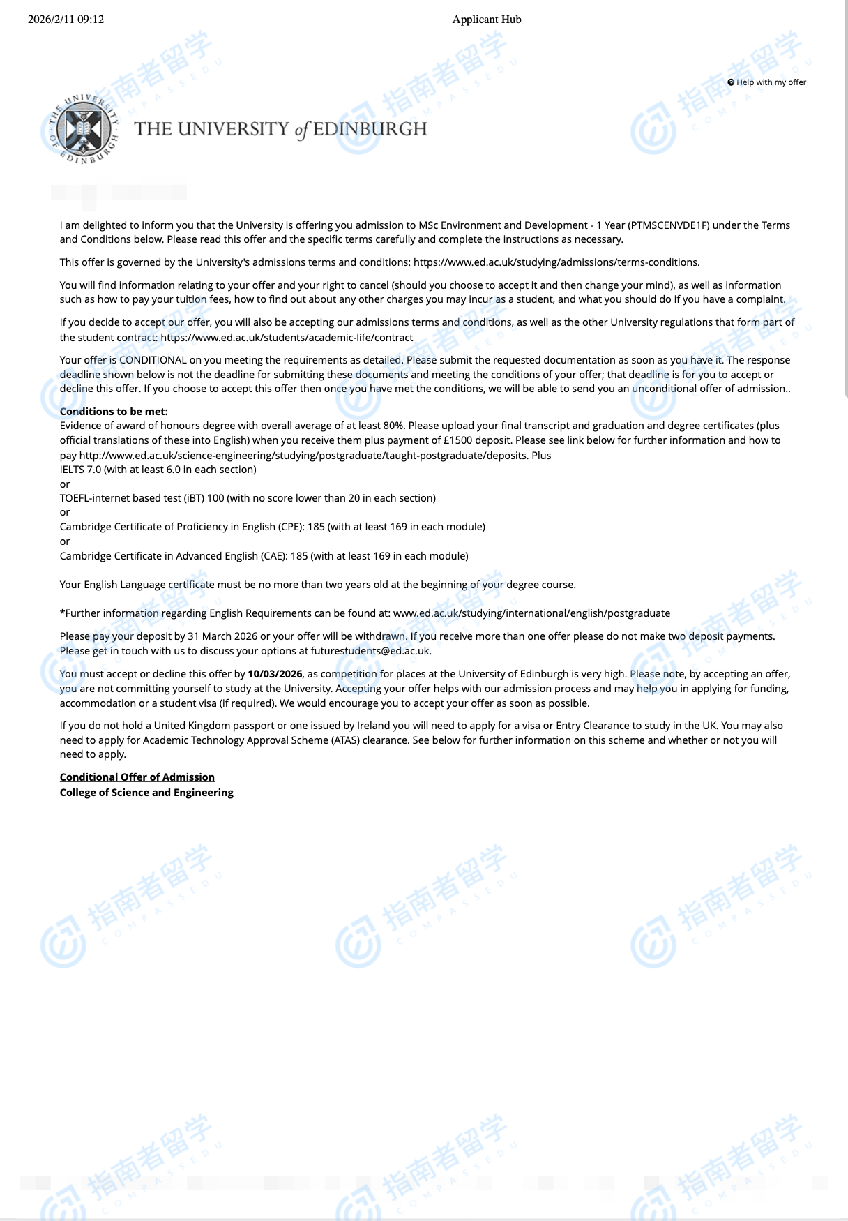 愛(ài)丁堡大學(xué)環(huán)境與發(fā)展理學(xué)碩士研究生offer一枚