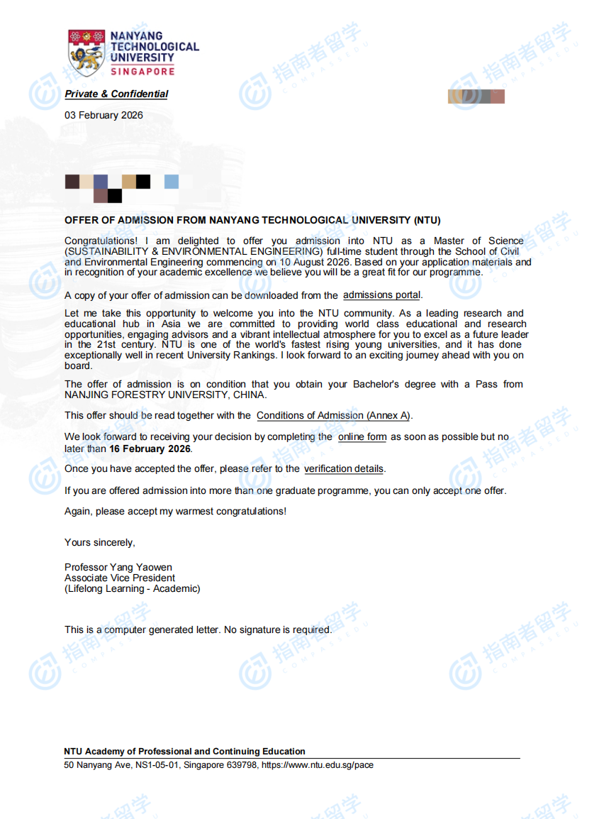 南洋理工大學(xué)可持續(xù)發(fā)展與環(huán)境工程理學(xué)碩士研究生offer一枚