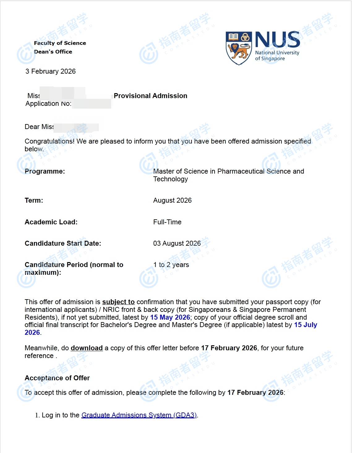 新加坡國立大學制藥科學與技術理學碩士研究生offer一枚