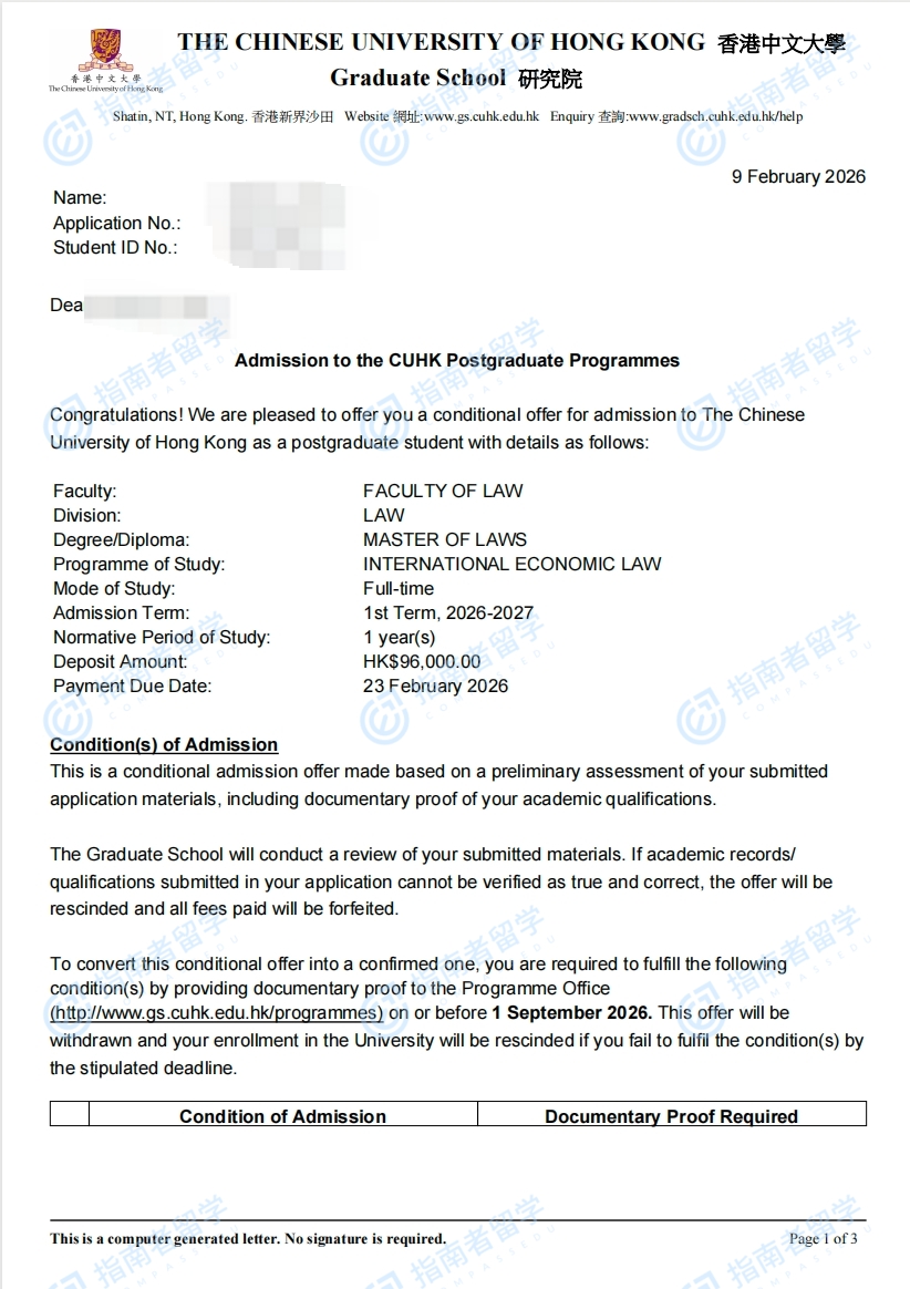 香港中文大學國際經(jīng)濟法法學碩士研究生offer一枚