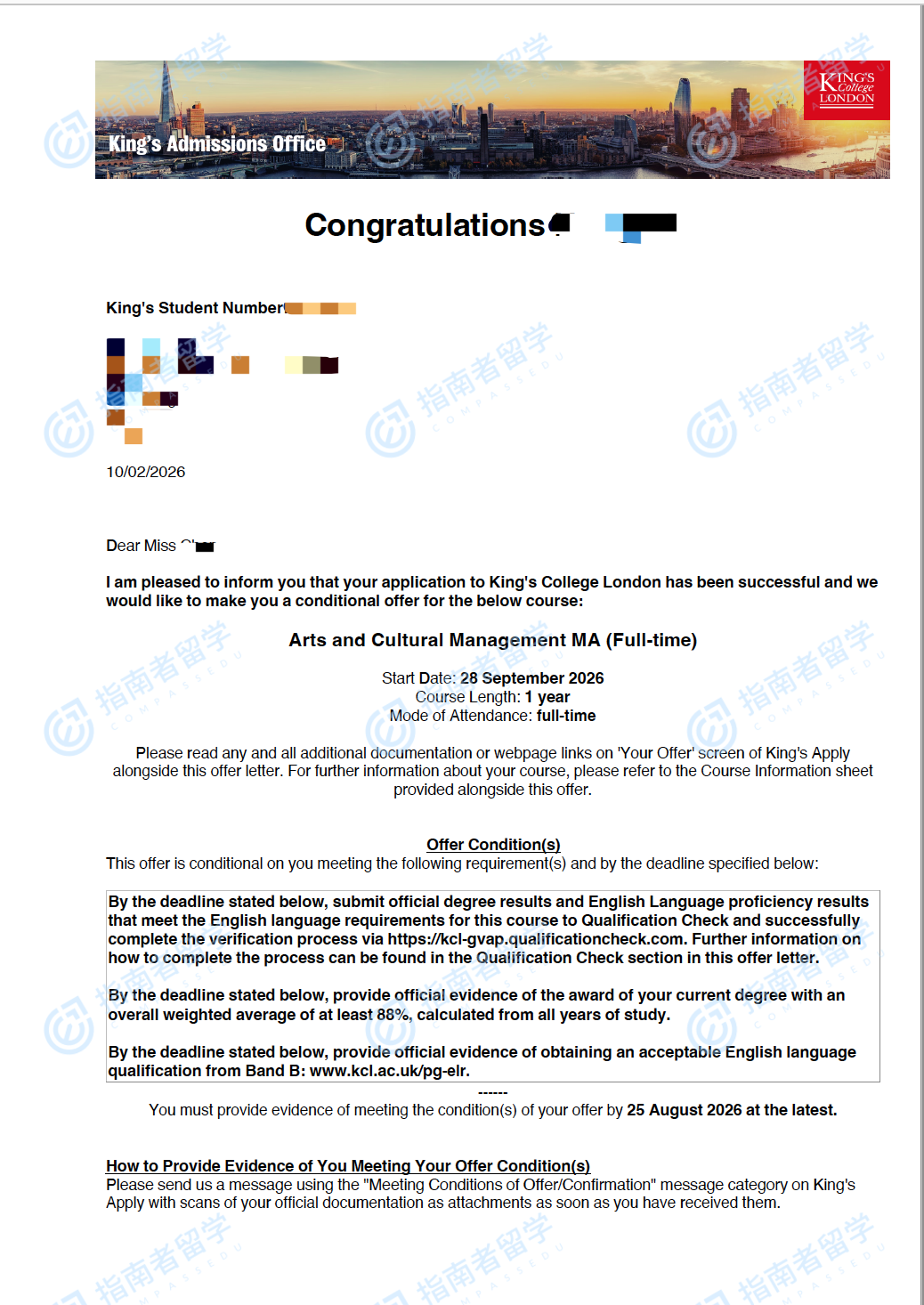 倫敦大學(xué)國(guó)王學(xué)院藝術(shù)與文化管理文學(xué)碩士研究生offer一枚