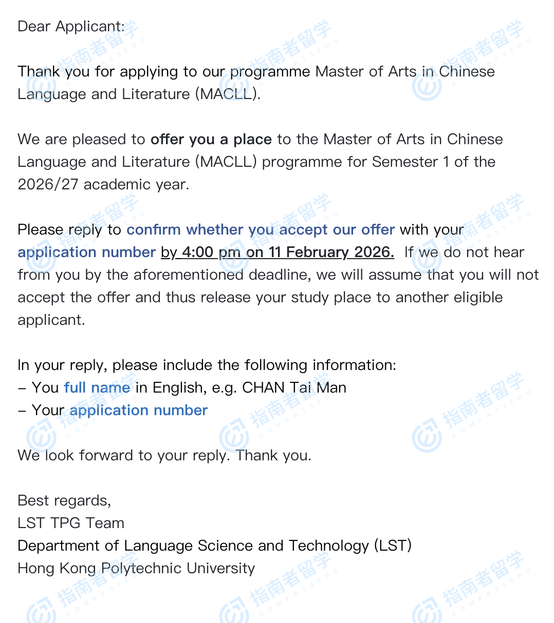 香港理工大學(xué)中國語文文學(xué)碩士研究生offer一枚