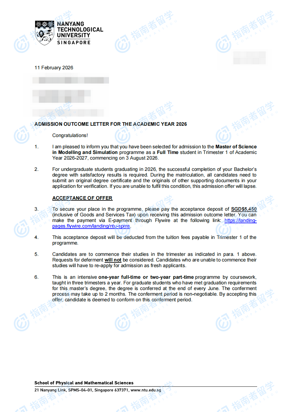 南洋理工大學(xué)建模與仿真理學(xué)碩士研究生offer一枚