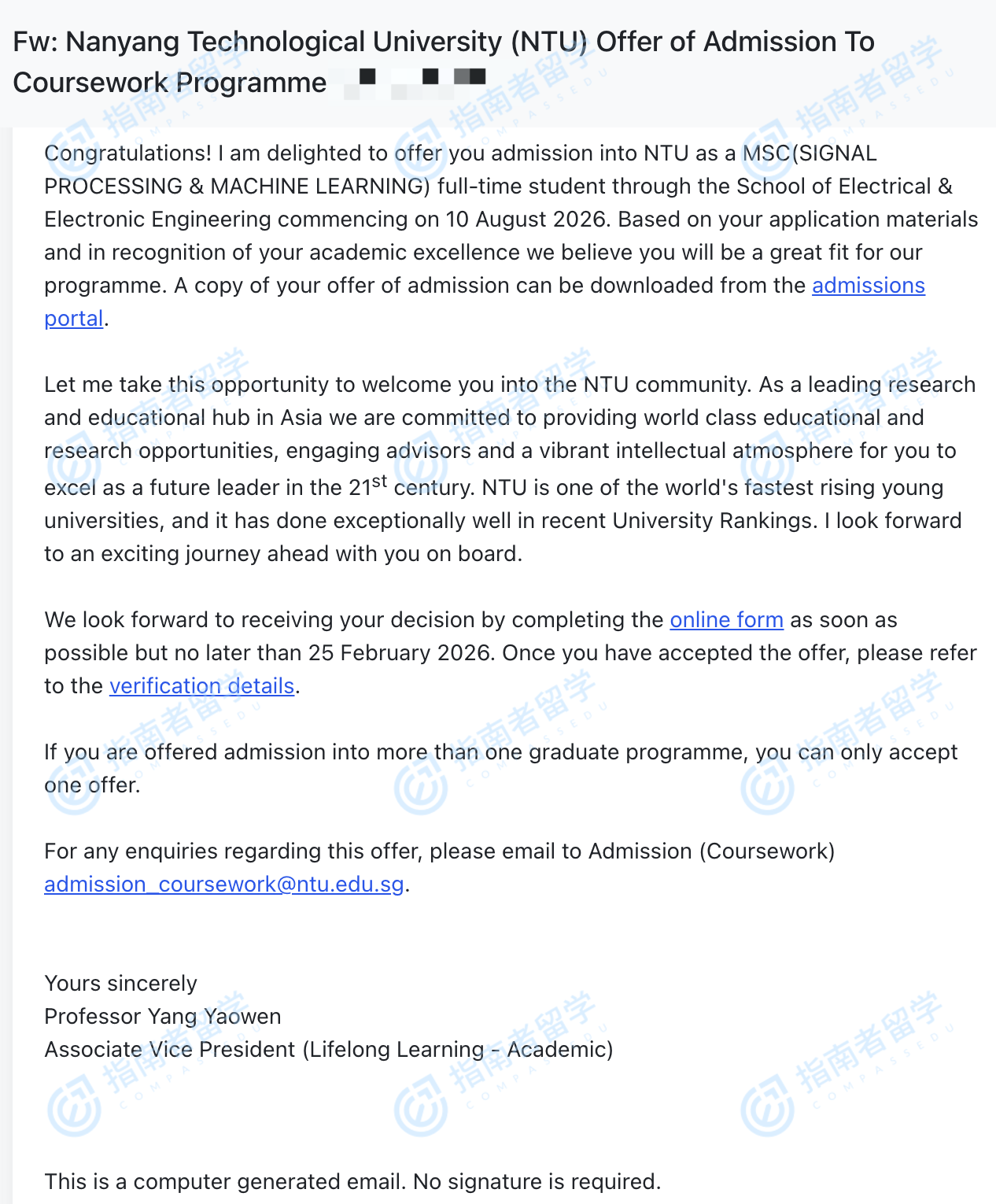 南洋理工大學(xué)信號(hào)處理和機(jī)器學(xué)習(xí)理學(xué)碩士研究生offer一枚