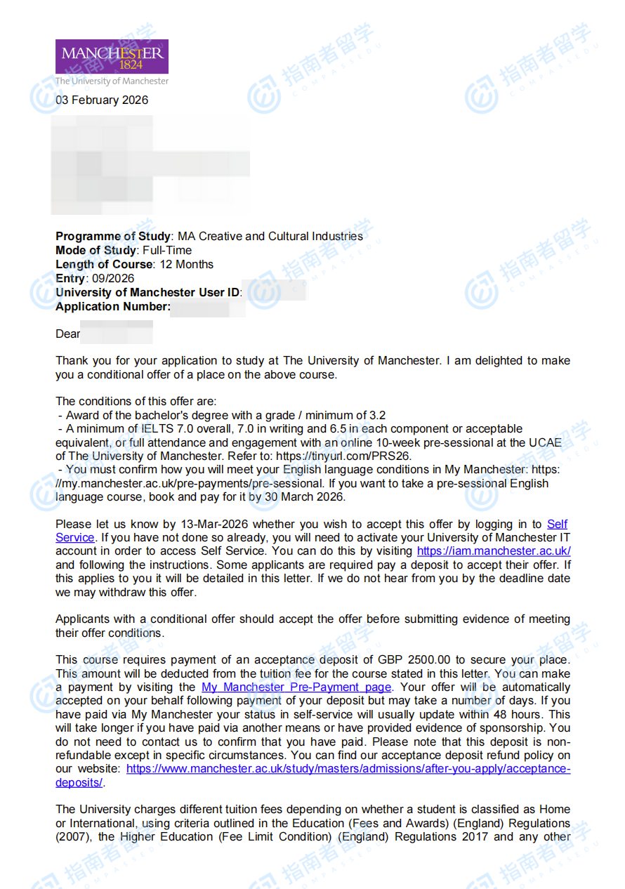 曼徹斯特大學(xué)創(chuàng)意與文化產(chǎn)業(yè)文學(xué)碩士研究生offer一枚