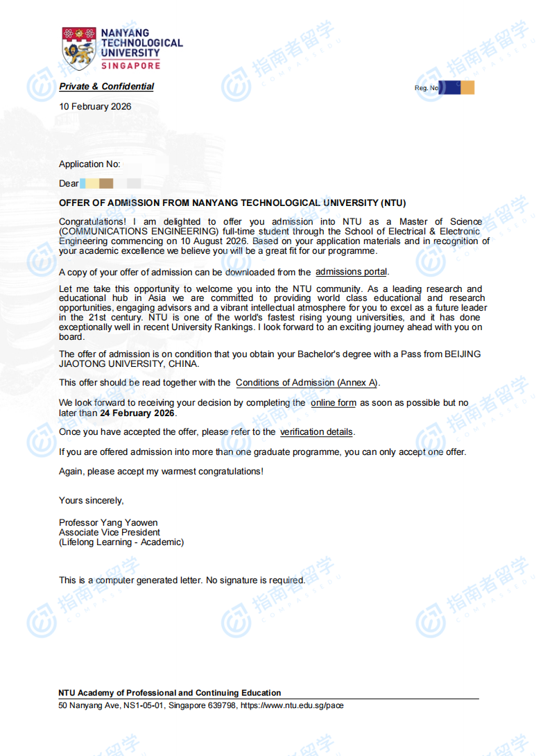 南洋理工大學通信工程理學碩士研究生offer一枚