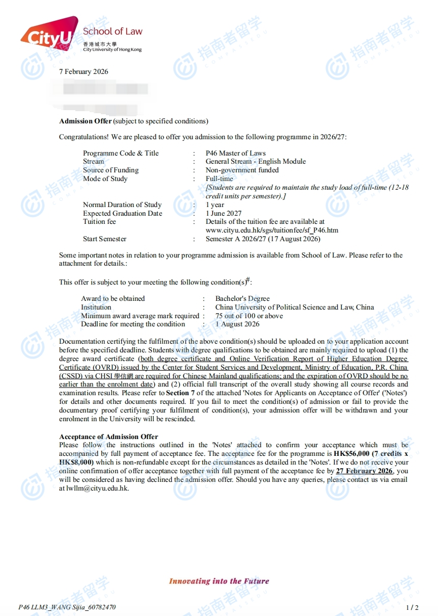 香港城市大學(xué)法學(xué)碩士研究生offer一枚