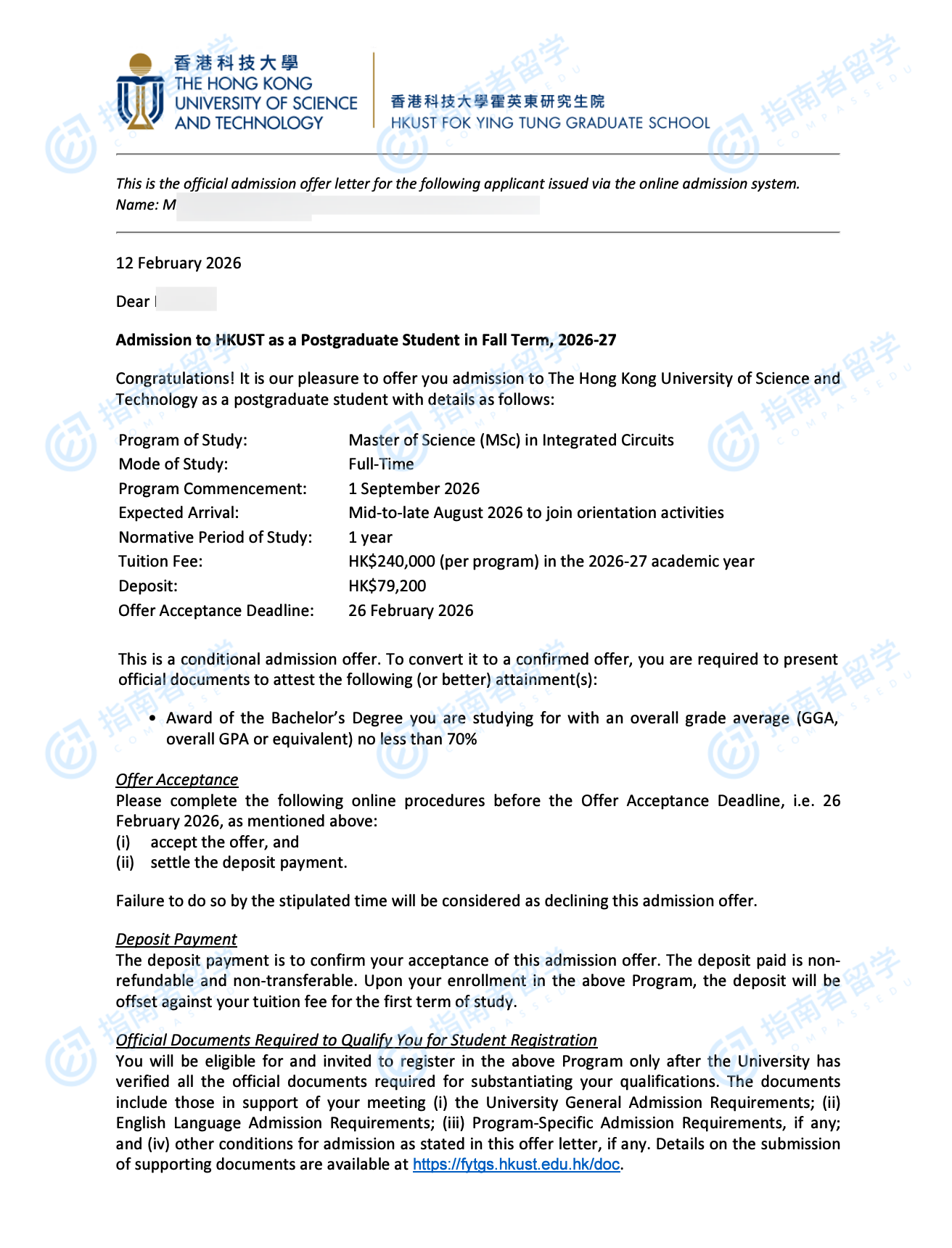 香港科技大學(xué)集成電路理學(xué)碩士研究生offer一枚