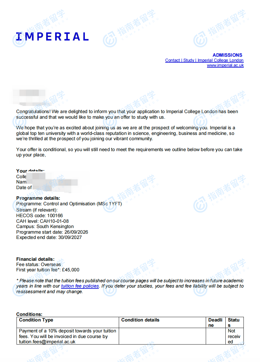 帝國(guó)理工學(xué)院控制與優(yōu)化理學(xué)碩士研究生offer一枚