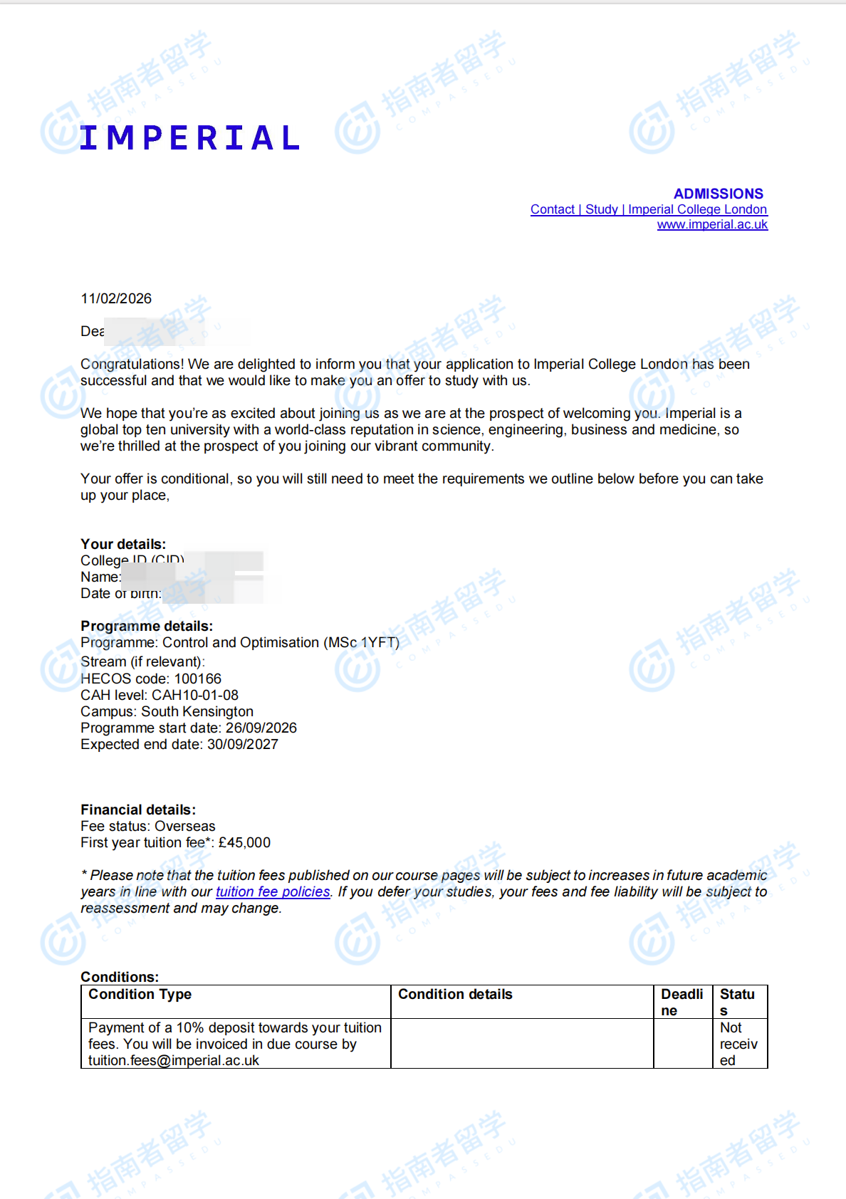 帝國理工學(xué)院控制與優(yōu)化理學(xué)碩士研究生offer一枚