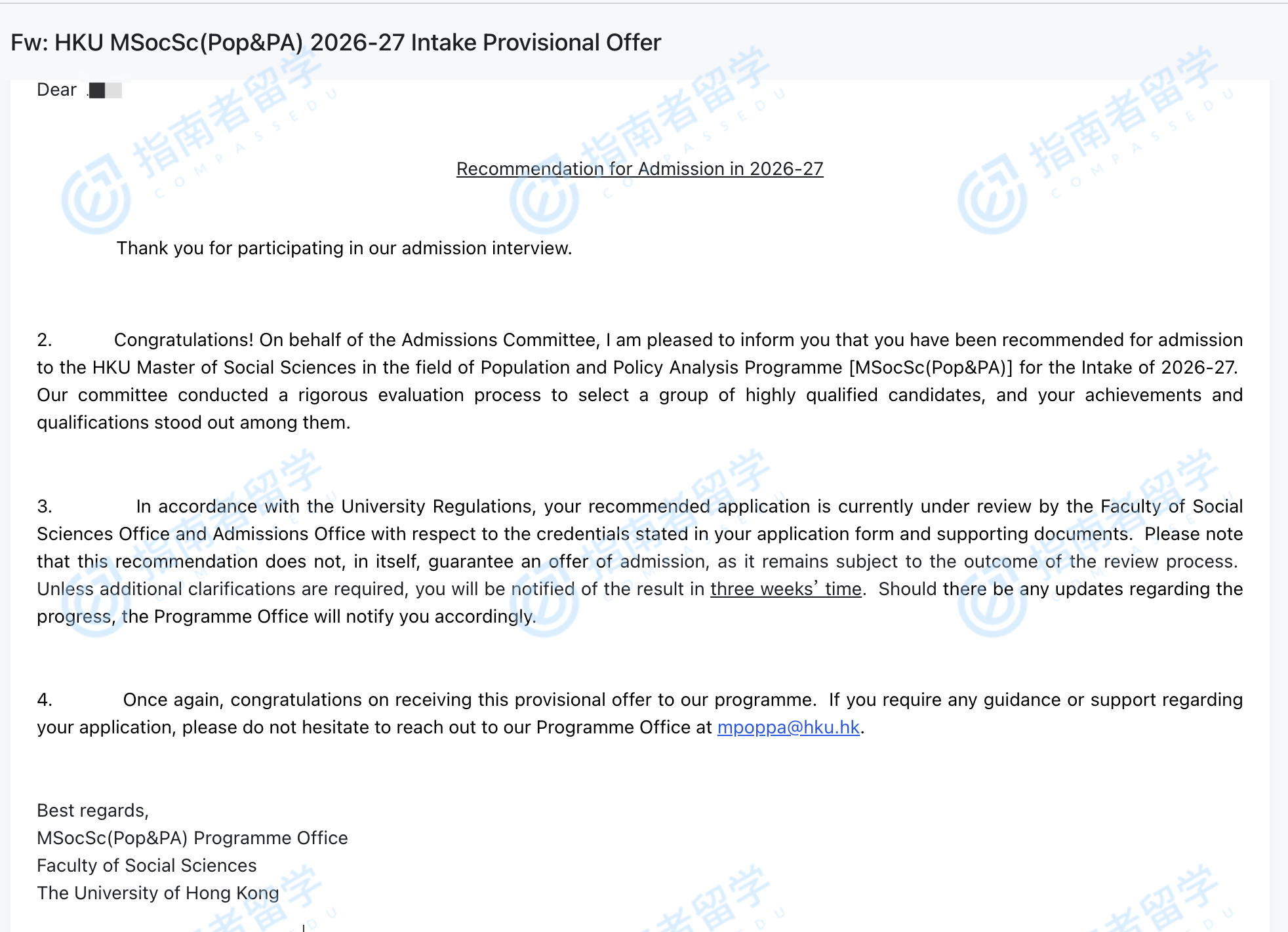 香港大學人口與政策分析社會科學碩士研究生offer一枚
