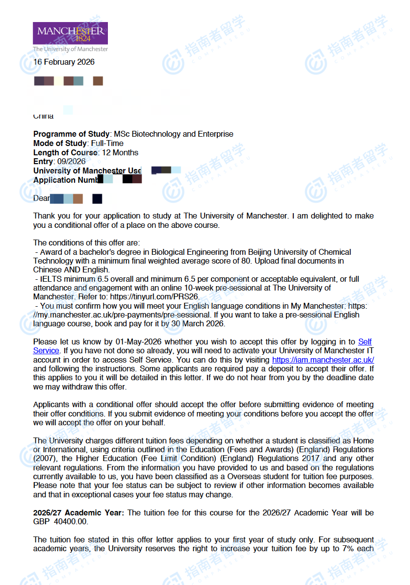 曼徹斯特大學生物技術與企業(yè)理學碩士研究生offer一枚
