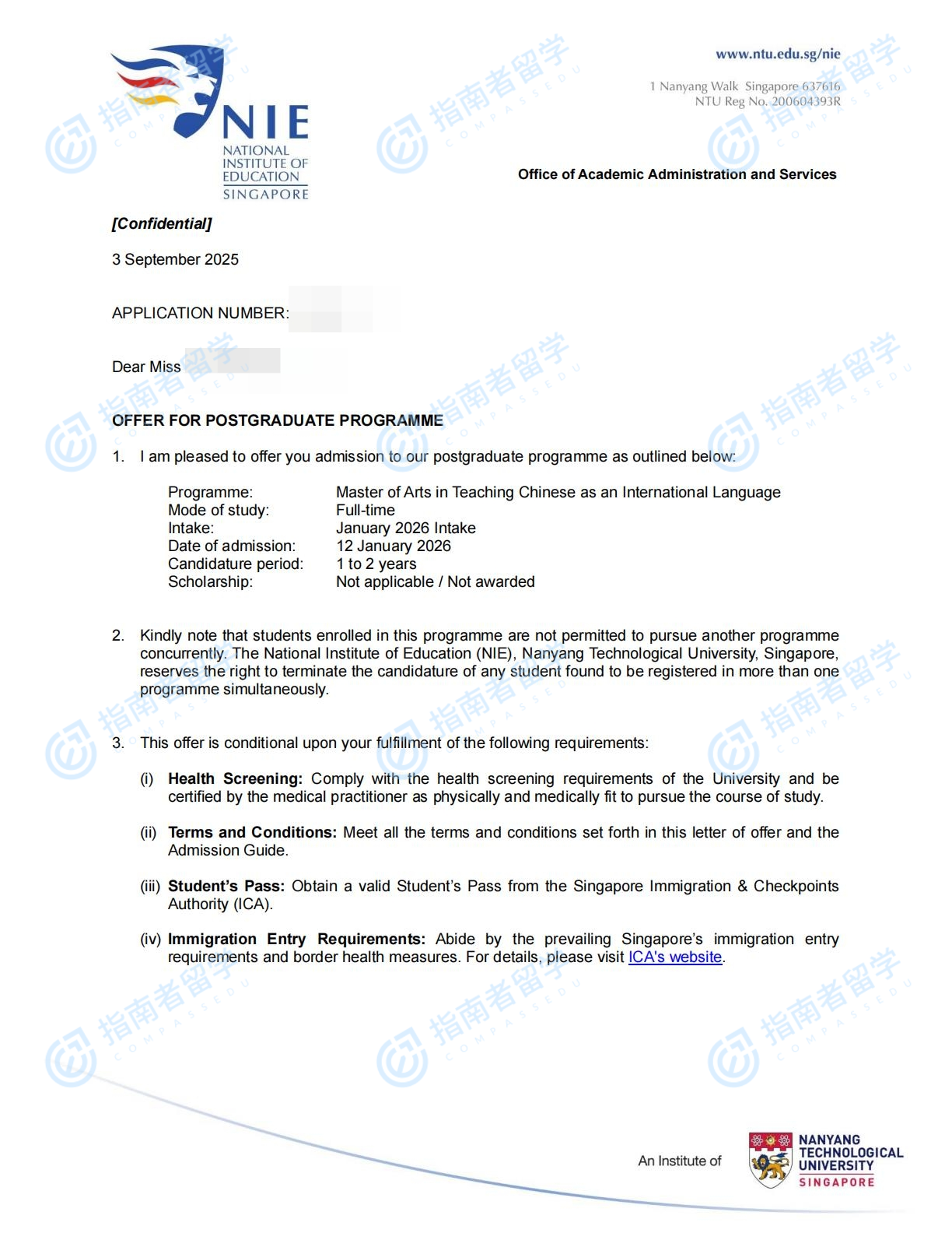 南洋理工大學對外漢語教學文學碩士研究生offer一枚